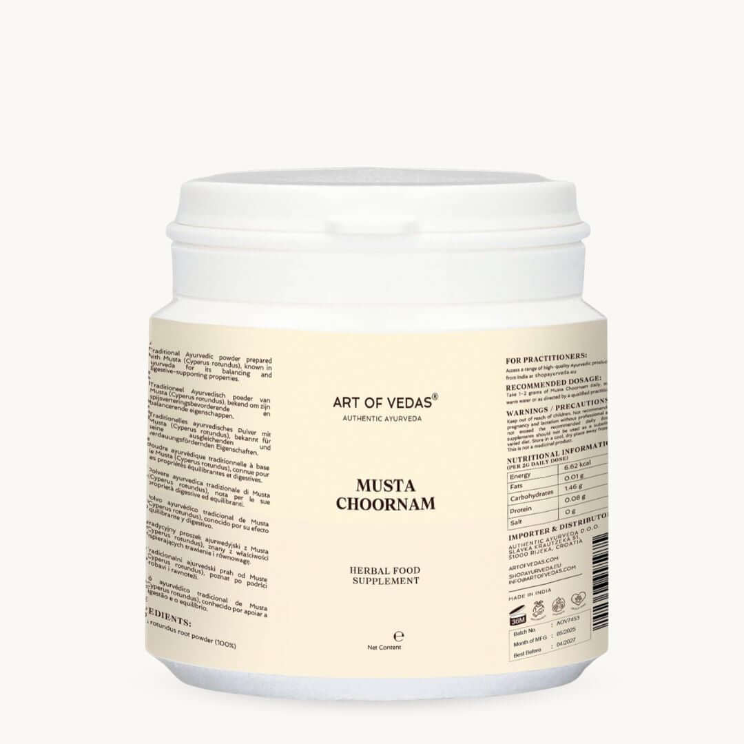 Musta Choornam is a classical Ayurvedic powder prepared from the rhizome of Cyperus rotundus, a revered herb known for its deep action on the digestive fire (Agni) and Pitta dosha. Traditionally used in postnatal care, children’s wellness, and Pitta conditions, it is a gentle and effective formulation prepared according to classical Ayurvedic methods.